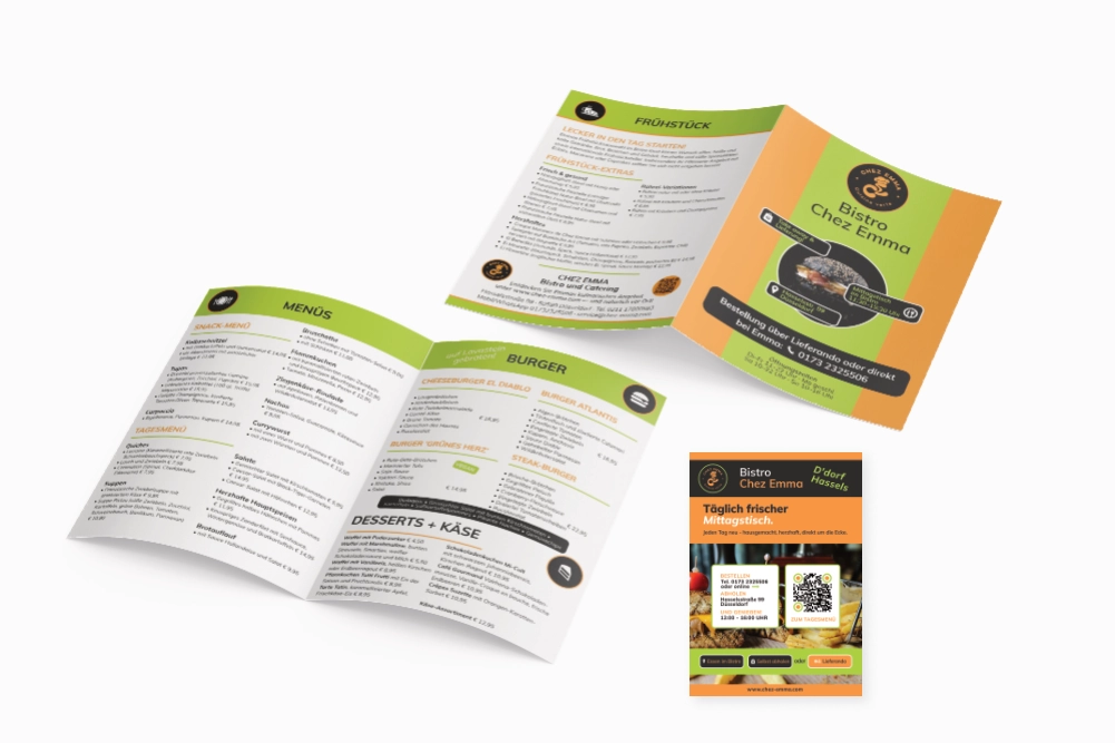 Die Erstellung von Print-Material, wie Speisekarten, Visitenkarten oder Flyer, sowie die Content-Kreation für Ihre Social-Media-Aktivitäten runden mein Angebot ab. Alle Services erhalten Sie bei mir aus einer Hand – das spart Zeit, Abstimmungsschleifen und teure Agenturaufschläge.